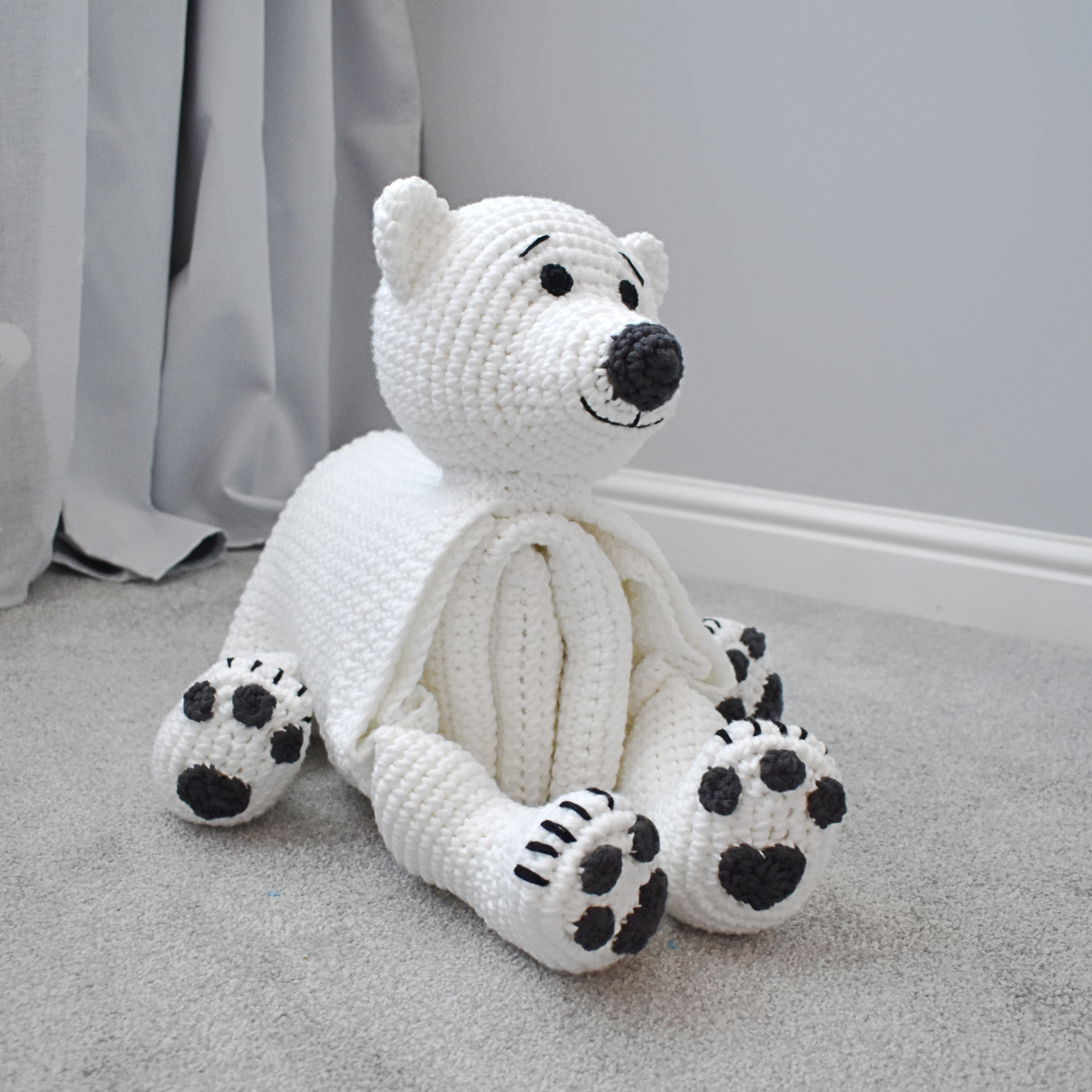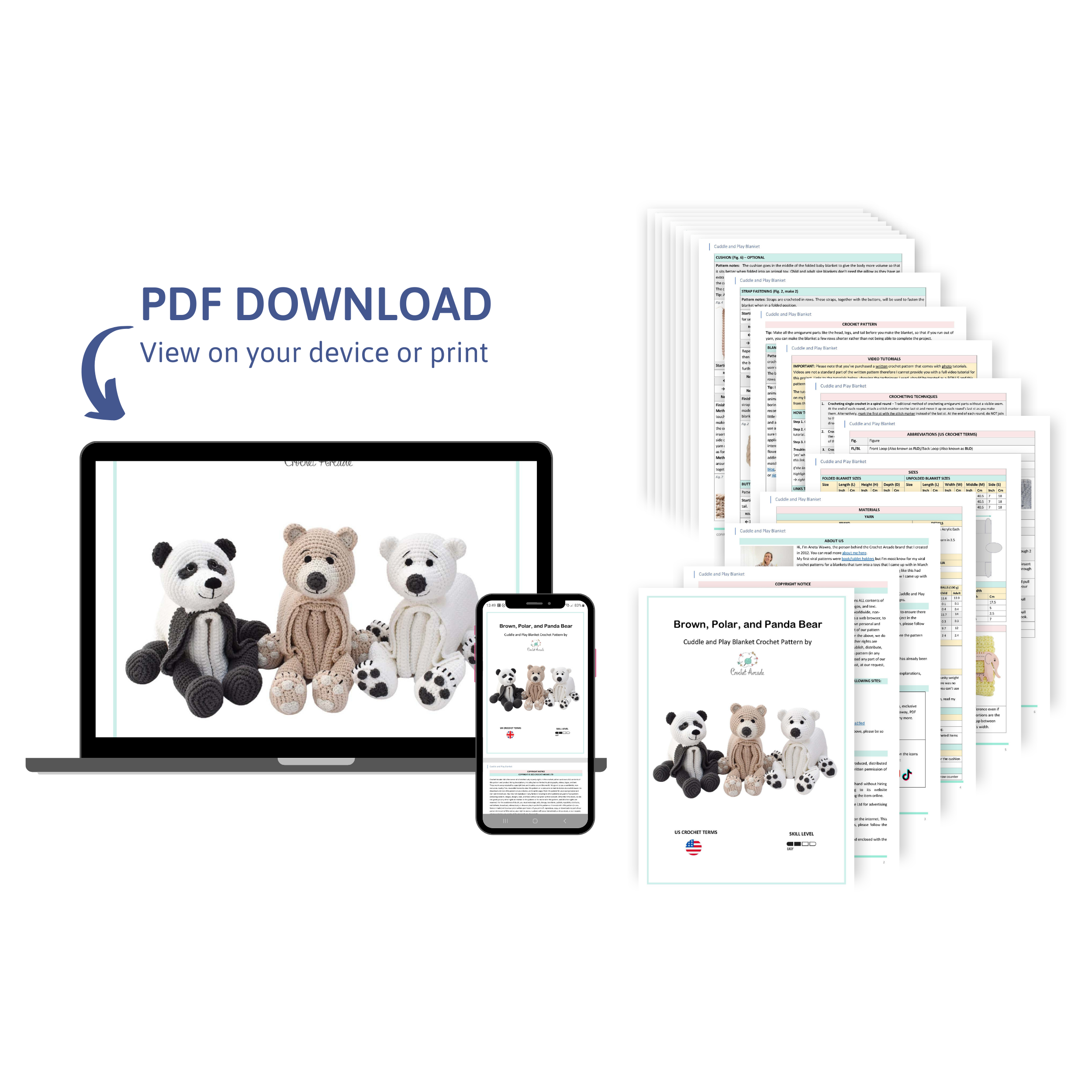 Pattern is written over 26 pages and contains very detailed written description supported by a lots of notes, detailed photos, links to tutorials and videos. The crochet pattern includes 3 bear variations including polar bear, panda bear, and teddy bear. I’ve used a special marking method so you don’t need to guess where to sew on parts or embroider things (ears, eyes etc.). Exact places where to sew on the parts are also highlighted on the photos.